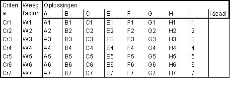 In een weegtabel worden horizontaal de verschillende oplossingen uiteengezet en verticaal de wensen welke aan de oplossing gesteld worden.