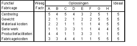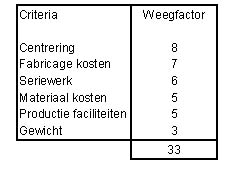 In het onderstaande voorbeeld is de volgorde van belangrijkheid van de criteria: centrering; fabricagekosten; seriewerk; materiaalkosten; productiefaciliteiten en gewicht. Daarna geeft ik elk criterium een cijfer van maximaal 10 en minimaal 1. Twee criteria kunnen even belangrijk zijn. Dan krijgen ze hetzelfde cijfer.
