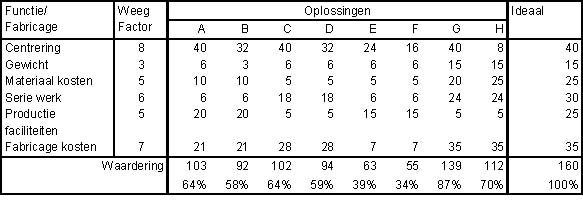 Er dient opgemerkt te worden dat deze oplossingen reeds aan de eisen zijn getoetst, zodat er alleen maar valide oplossingen worden beschouwd. De weegtabel bepaalt alleen welke oplossing het beste voldoet.