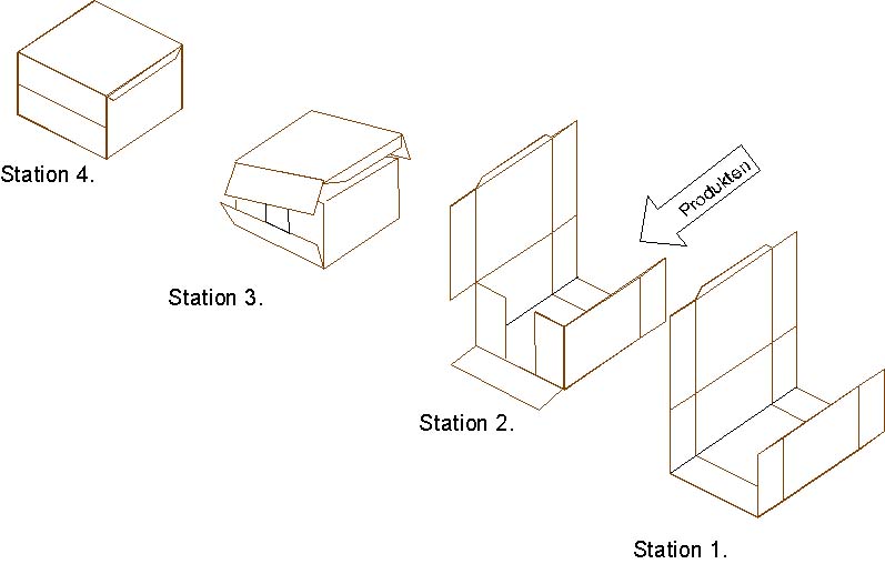 Het wrap-aroundstation heeft als functie een met producten gevulde doos haaks te sluiten. De functie kan worden onderverdeeld in het rechtzetten van de doos, het vouwen van de belijmde bevestigingsoppervlakken en aandrukken hiervan. Zie figuur