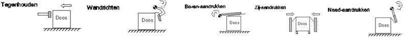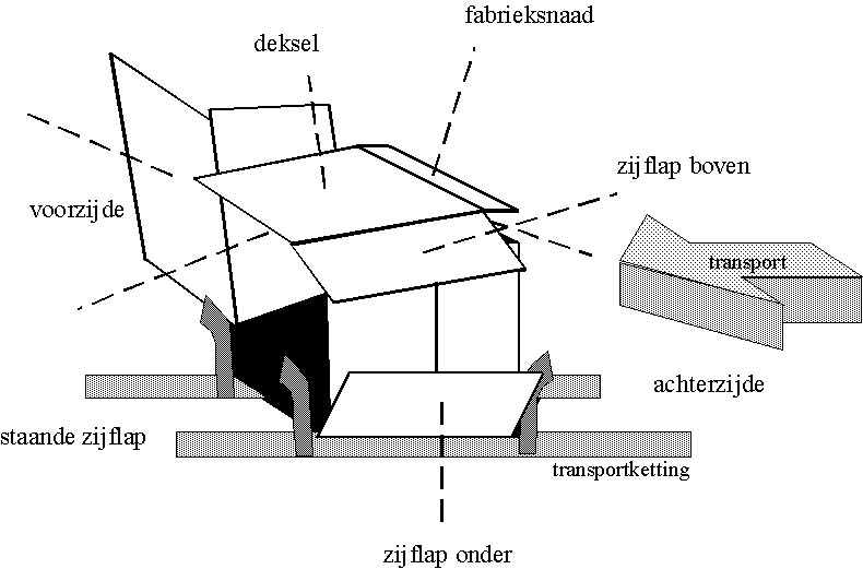 De machine vouwt in vier stations uit een plano een kartonnen doos om producten heen. De benamingen van de vlakken zoals worden gehanteerd zijn weergegeven in figuur